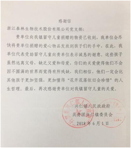 7月初,黨支部收到了興仁鎮(zhèn)兒童寄來的感謝信,信中表達了對泰林生物黨支部為他們帶去關(guān)懷與祝福的誠摯感謝。
