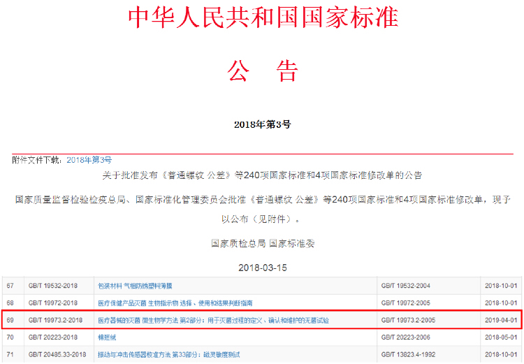 3月15日,國(guó)家質(zhì)量監(jiān)督檢驗(yàn)檢疫總局、國(guó)家標(biāo)準(zhǔn)化管理委員會(huì)發(fā)布2018年第3號(hào)中國(guó)國(guó)家標(biāo)準(zhǔn)公告,對(duì)新一批國(guó)家標(biāo)準(zhǔn)予以公布,其中包括了由泰林生物為第一起草單位的國(guó)家標(biāo)準(zhǔn)《醫(yī)療器械的滅菌 微生物學(xué)方法 第2部分:用于滅菌過(guò)程的定義、確認(rèn)和維護(hù)的無(wú)菌試驗(yàn)》。