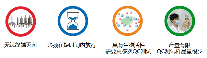 與傳統(tǒng)藥物相比前沿治療藥物(ATMP)在研發(fā)及生產(chǎn)過程中的產(chǎn)品質(zhì)量控制面臨諸多挑戰(zhàn),例如無法終端滅菌、傳統(tǒng)藥典中無菌檢查方法檢測(cè)周期長(zhǎng)、具有生物活性需要多次QC測(cè)試、產(chǎn)量有限QC測(cè)試樣品量少等。